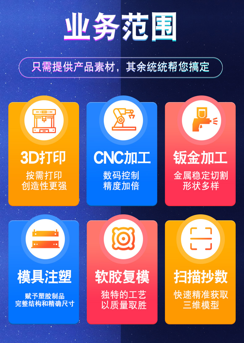 我司專業從事產品設計、手板、激光成型、快速模具、零件加工、3D打印、鈑金,能為客戶提供從產品設 計到 原型驗證、模具制造到產品小批量生產的一條龍服務,同時也可為客戶提供各環節的單項服務。擁有資深的專業技術人員,先進的加工設備,完善的質量控制體系。我們打破終端用戶與制造商之間的隔閡,滿足個性化需求。擁有專門的產品設計部門能夠與客戶合作生產獨特的定制項目和定制產品。